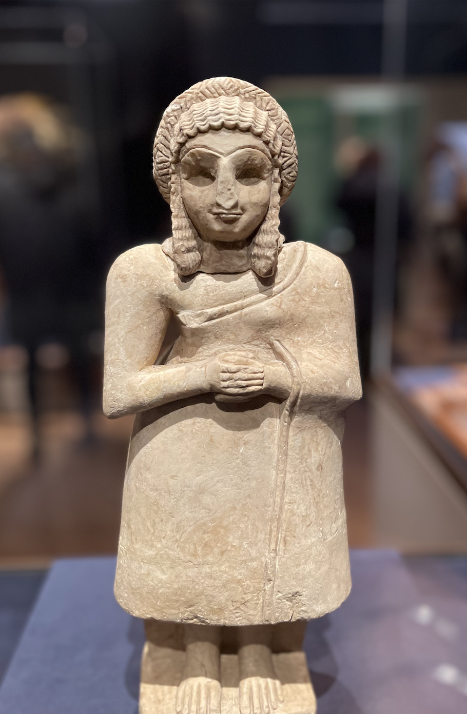Standing female figure with clasped hands, Tutub (modern Khafajah), “Sin” Temple IX, Early Dynastic IIIa period, (2600-2450 BC,)Gypsum and shell, The Oriental Institute of the University of Chicago, excavated 1933/34; A12412.